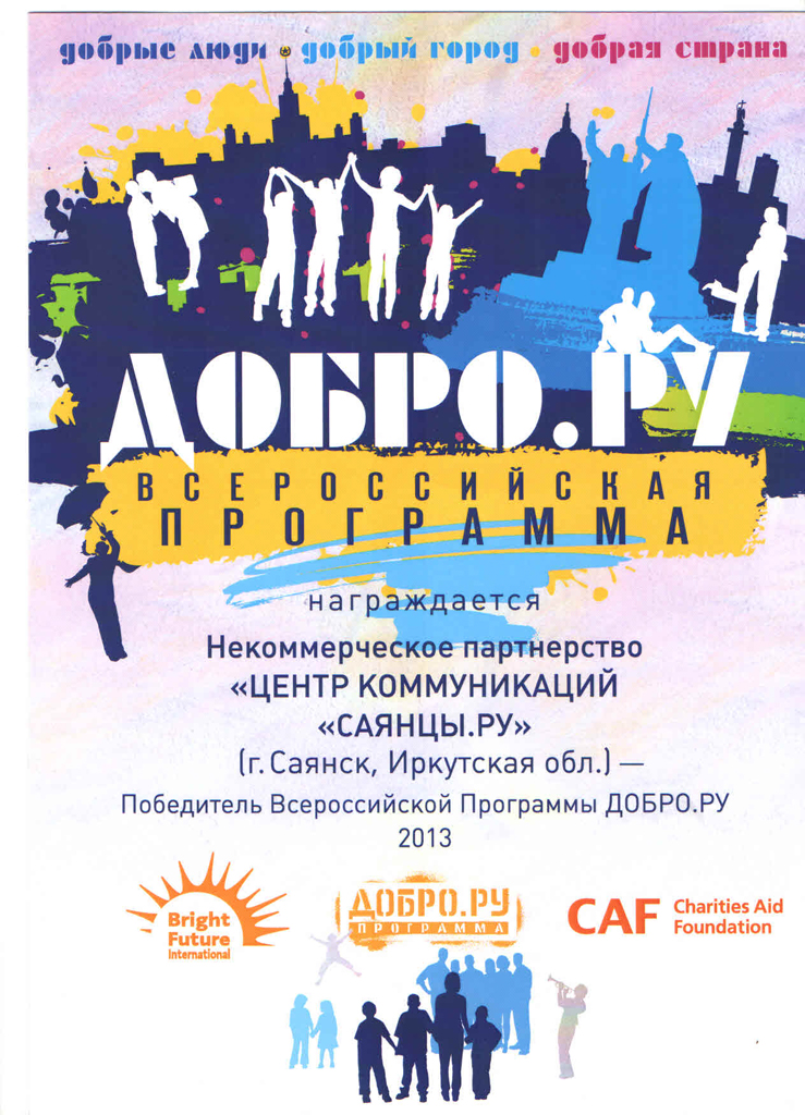 Некоммерческое партнерство «Центр коммуникаций «Саянцы.ру» вошло в десятку лучших организаций по версии Всероссийской Программы Добро.ру. Церемония награждения проходила на сцене Томской филармонии в городе Томске. Помимо диплома, сувениров, оплаты проезда до места церемонии, победителей порадовал гала-концерт и премия в 75 000 рублей. Деньги планируется потрать на приобретение недостающего оборудования для работы, формирование фирменного стиля, оплату услуг связи.