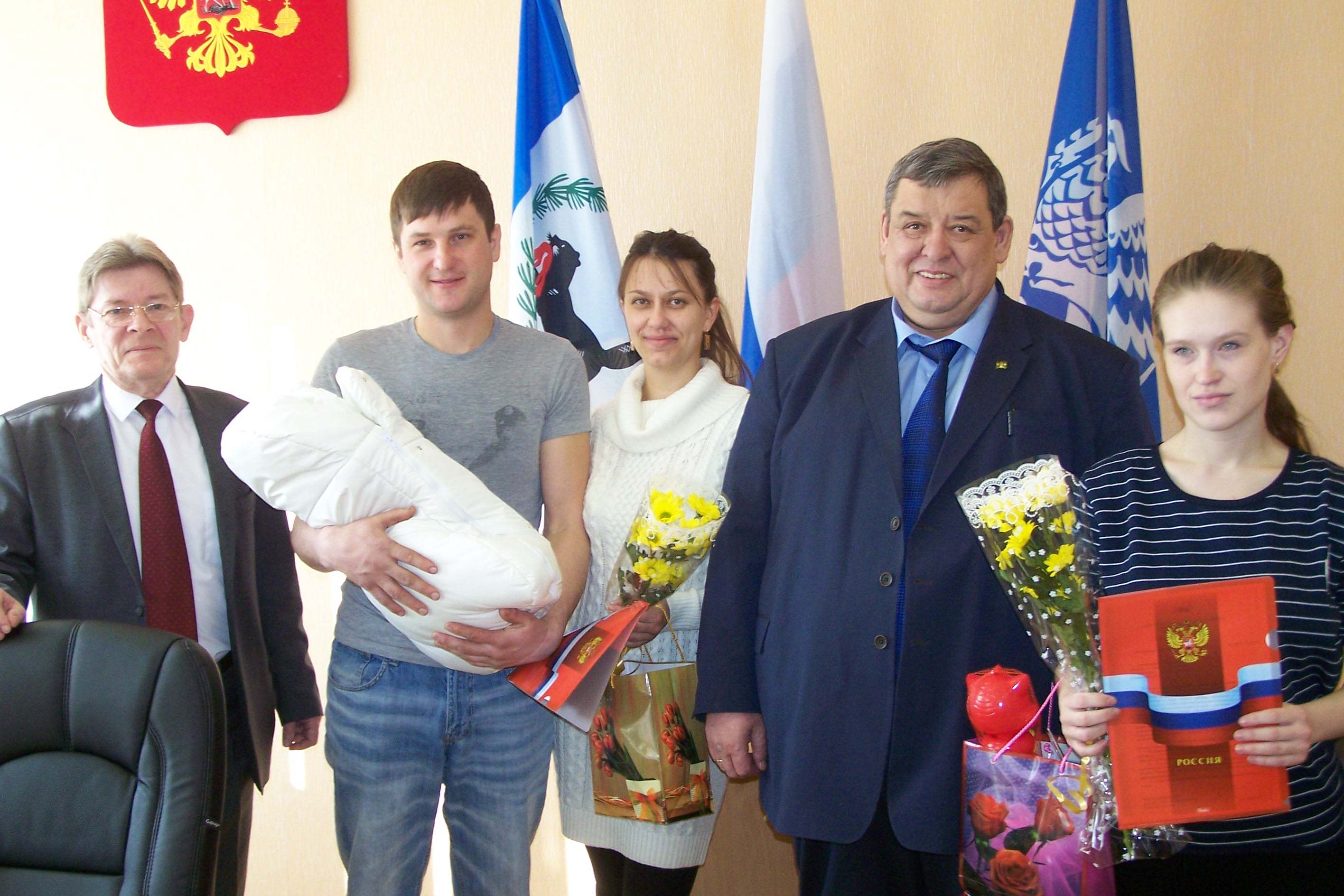 С важным событием три саянские семьи поздравили мэр города Олег Боровский, а также заместитель мэра по социальным вопросам, секретарь Саянского местного отделения партии «Единая Россия» Александр Ермаков и директор Управления соцзащиты по городу Саянску Сергей Кривопалов. Счастливые родители получили цветы и подарки для своих малышей.