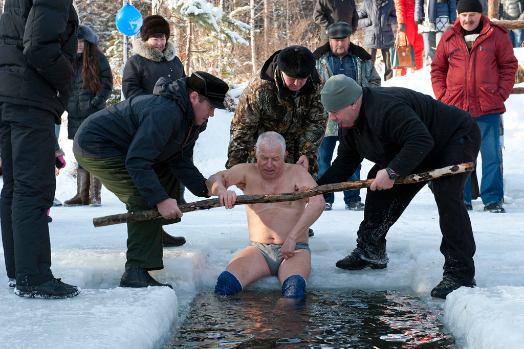 И здесь уже под одобрительные возгласы и ободряющие призывы, получив "напутствие" по мягкому месту снеговой лопатой от бывалого "моржа", сигануть, прыгнуть, погрузиться в прорубь.