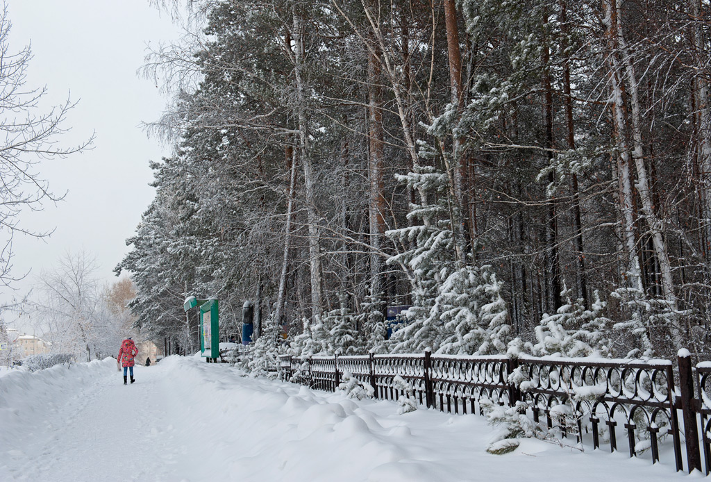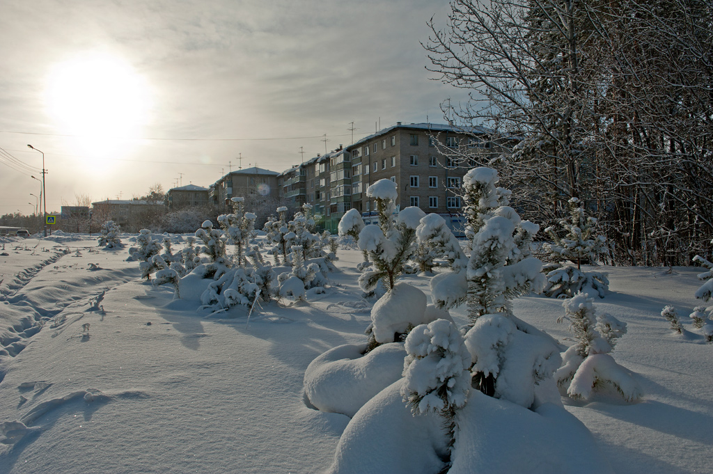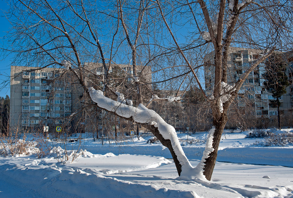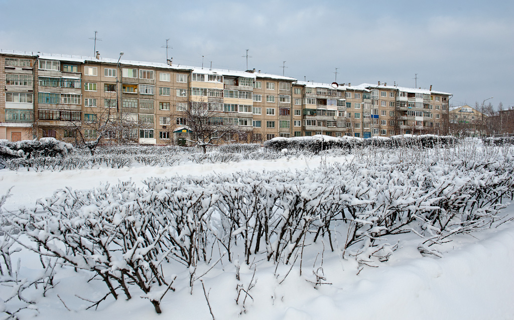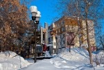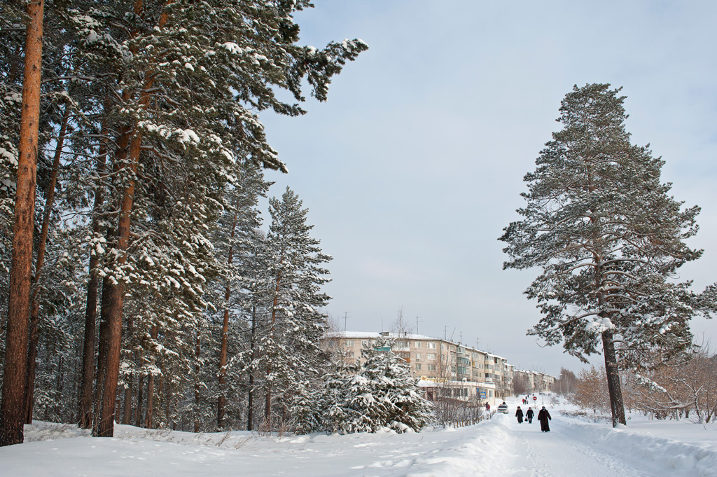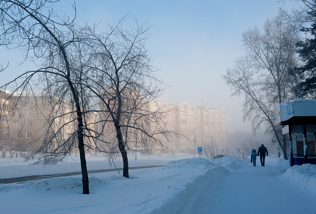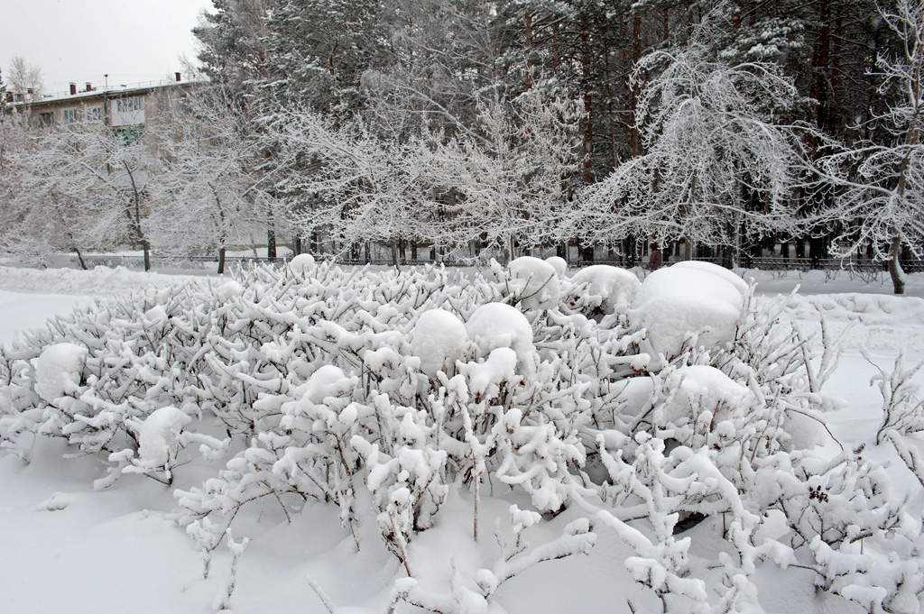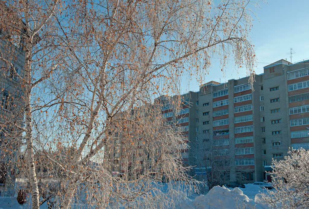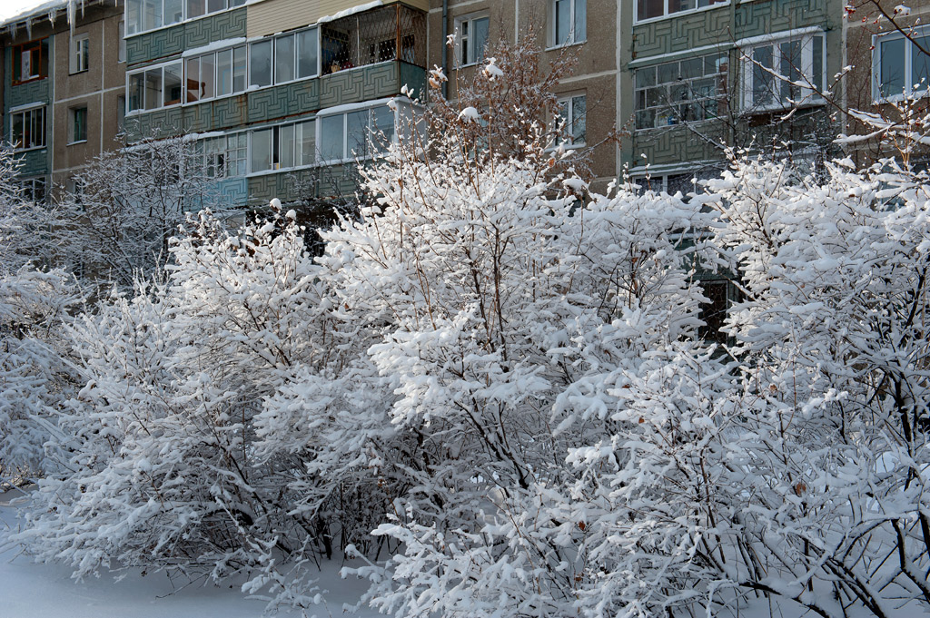 Белый город, белый снег, белый дом и человек.