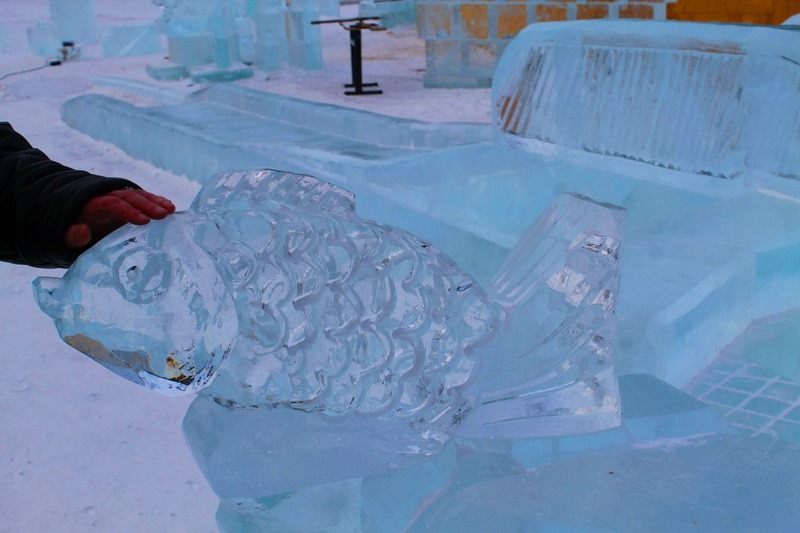 Даже несмотря на пасмурный день, прозрачный лед, из которого выполняются скульптуры, выглядит ярко и празднично.